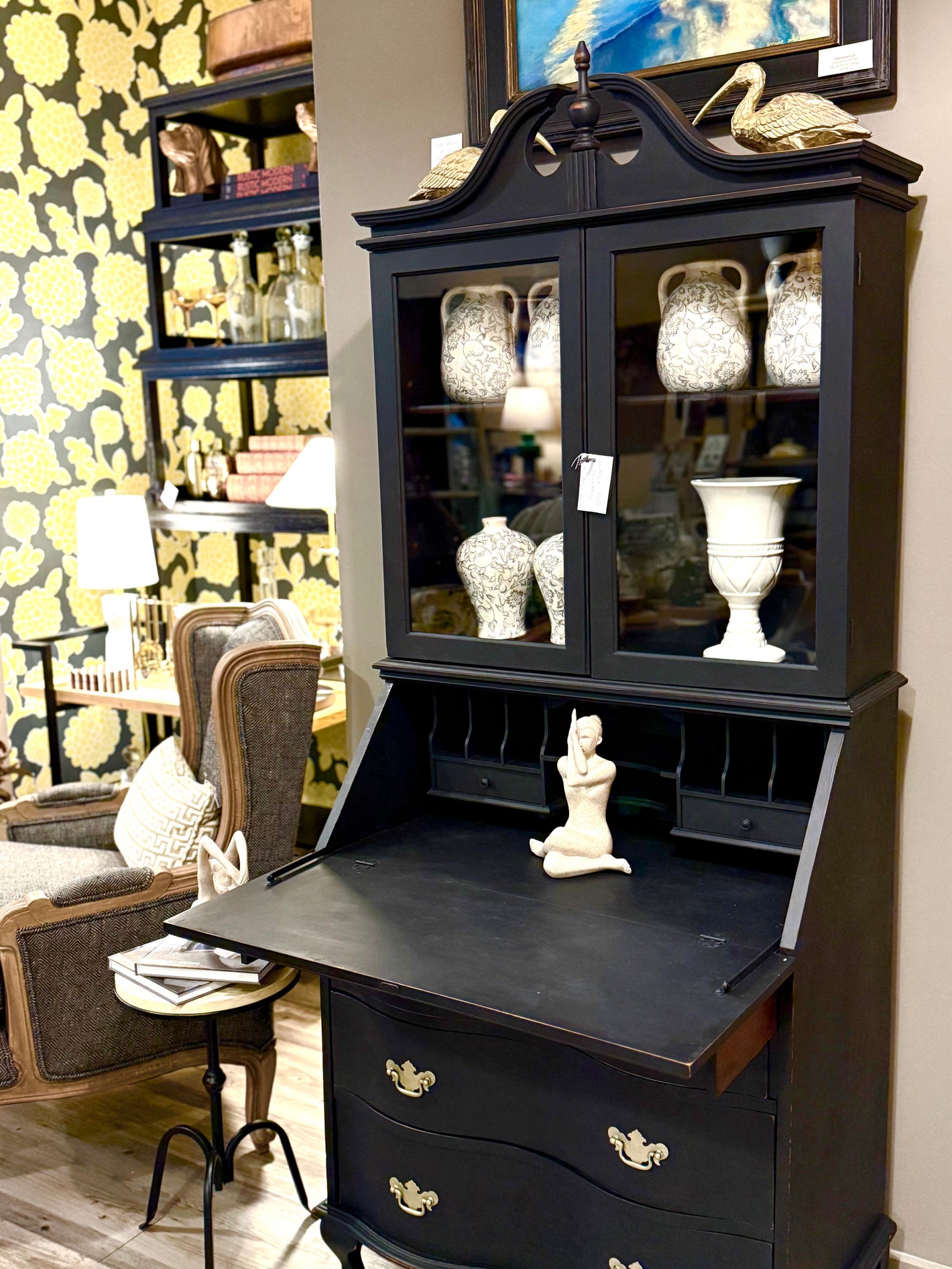 Everything is for sale! From the grab and go gifts, to the artwork, sofa, lamps, pillows and accent tables/chairs. We carry Forty West Designs, Villa & House, and Woodbridge Furniture, to name a few. If you are looking for something specific, we can help source or have someone custom make a piece for you! Additionally, we are now dealers for Thibaut + Anna French Wallpaper! We have an eclectic mix of old and new and you can always expect the store to have a new look!